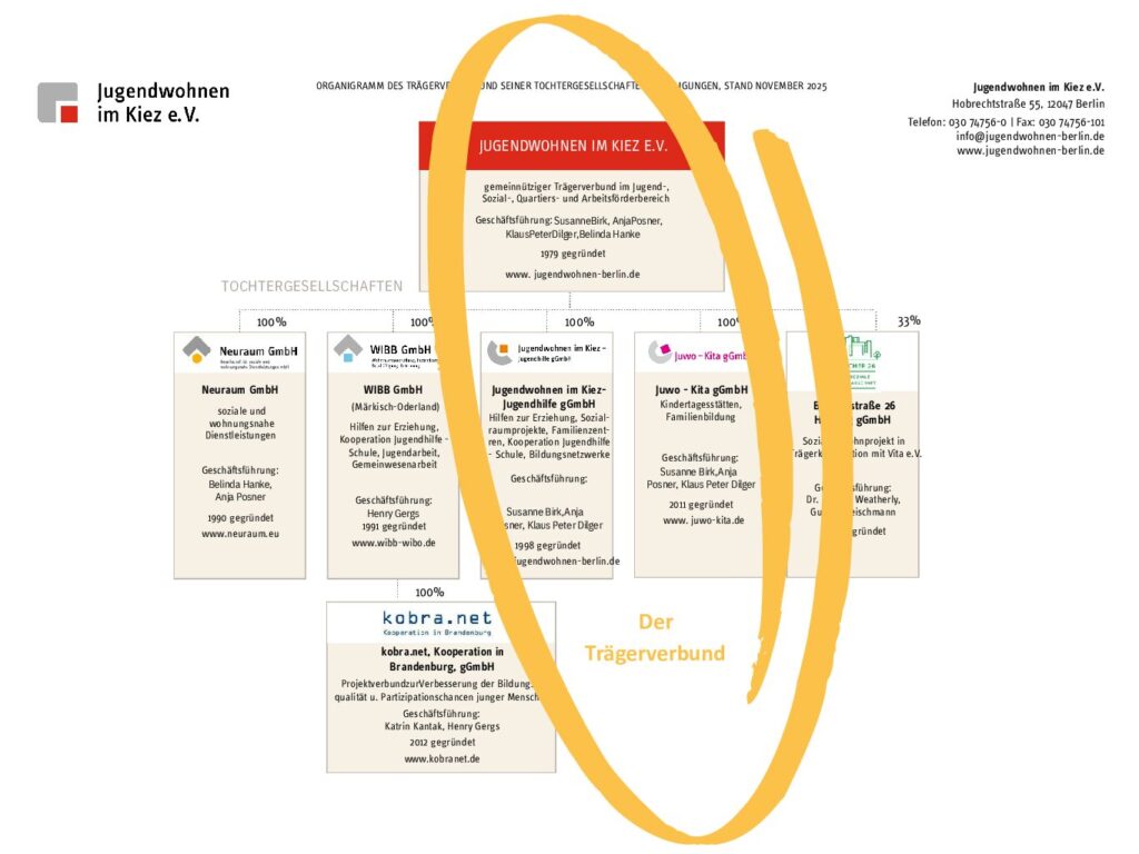 🔴 Jugendwohnen im Kiez e.V. ist „die Mutter“ des Verbunds. Bereits seit 1979 entwickelt der Verein alternative Wohn- und Unterstützungsformen für Jugendliche. Aus dem Verein heraus entstanden im Laufe der Jahre mehrere weitere Gesellschaften, mit unterschiedlichen Schwerpunkten.